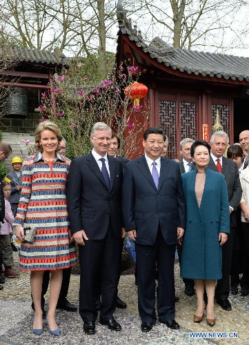 Chinese President Xi Jinping (2nd R, front), his wife Peng Liyuan (front R), Belgian King Philippe (2nd L, front) and Queen Mathilde (L) pose for a photo in front of a magnolia tree that symbolizes friendship at the Pairi Daiza zoo in Brugelette, Belgium, March 30, 2014. Xi and Belgian King Philippe attended the inauguration of a panda house at the zoo on Sunday. (Xinhua/Ma Zhancheng)