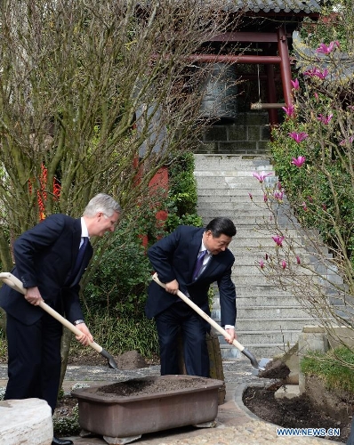 Chinese President Xi Jinping (R) and Belgian King Philippe shovel soil on a magnolia tree that symbolizes friendship at the Pairi Daiza zoo in Brugelette, Belgium, March 30, 2014. Xi and Belgian King Philippe attended the inauguration of a panda house at the zoo on Sunday. (Xinhua/Ma Zhancheng)