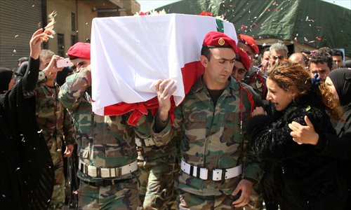 Relatives mourn as Lebanese soldiers carry the coffin of their comrade Mahmoud Ibrahim Hajj Hassan, who died in a suicide bombing, during his funeral on Tuesday in the village of Talia in the Bekaa Valley. The soldier was killed by a suicide car bomber near the border with Syria in eastern Lebanon on Saturday. Photo: AFP