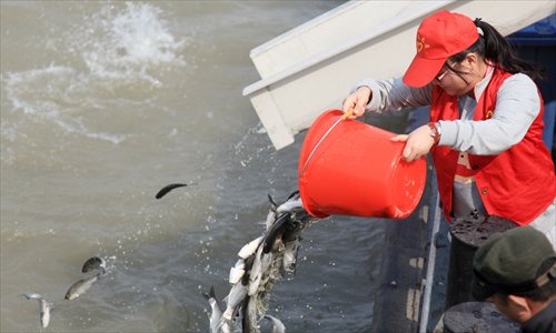 A worker releases fish fry into the Yangtze River in Zhangjiagang, Jiangsu Province on March 18. The activity has been held for the past few years to preserve the fishery resources. Photo: CFP