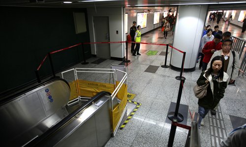 Authorities cordon off an escalator that malfunctioned Wednesday at Jing'an Temple Station, leaving 13 people injured. Photo: Cai Xianmin/GT