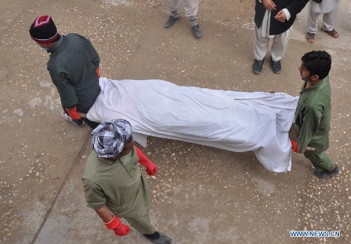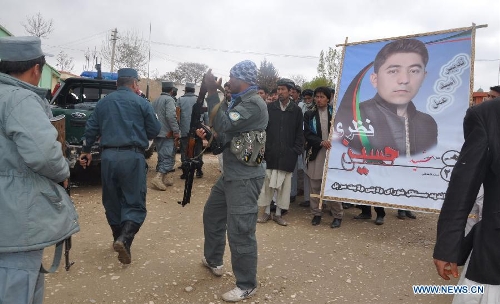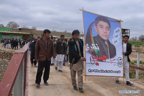 Afghans carry the coffin of a kidnapped provincial council runner in Sari Pul province of northern Afghanistan on April 2, 2014. Taliban militants killed the kidnapped provincial council runner and eight civilians in the country's northern province of Sari Pul overnight, officials said on Wednesday. (Xinhua/Arui)