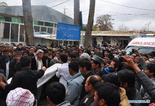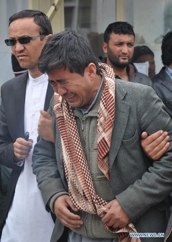 A relative of a kidnapped provincial council runner cries in Sari Pul province of northern Afghanistan on April 2, 2014. Taliban militants killed the kidnapped provincial council runner and eight civilians in the country's northern province of Sari Pul overnight, officials said on Wednesday. (Xinhua/Arui)