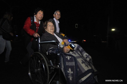 People push the wheelchair of a senior lady after an earthquake in Iquique, Chile, on April 3, 2014. A 7.8-magnitude earthquake jolted sea off north coast of Chile at 10:43 a.m. Thursday (Beijing Time), according to the China Earthquake Networks Center. (Xinhua/AGENCIA UNO)