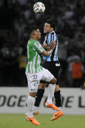 Alexander Mejia (No.13) of Colombia's Atletico Nacional vies with Brazilian side Gremio's Edinho during their Copa Libertadores match in Maedellin, Colombia on Wednesday (Colombian time). Gremio won 2-0. Photo: IC