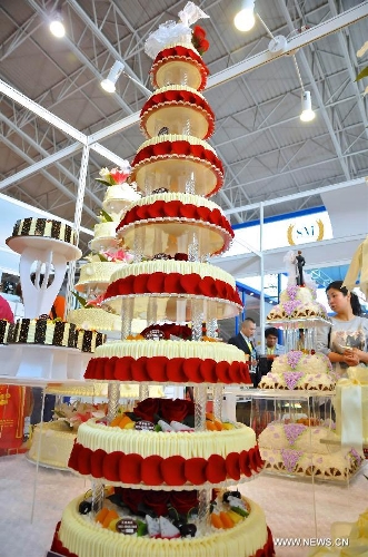 Visitors watch a tower cake model during 2014 China Beijing International Bakery, Icecream and Food Processing and Packaging Exhibition in Beijing, capital of China, April 8, 2014. The exhibition, which kicked off on April 8, will last for three days. (Xinhua/Ma Zhiyu)