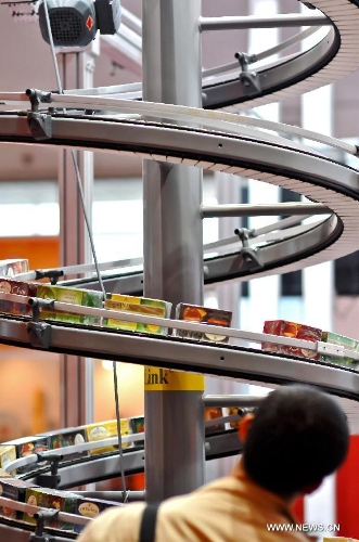 A visitor watches a food production line during 2014 China Beijing International Bakery, Icecream and Food Processing and Packaging Exhibition in Beijing, capital of China, April 8, 2014. The exhibition, which kicked off on April 8, will last for three days. (Xinhua/Ma Zhiyu)