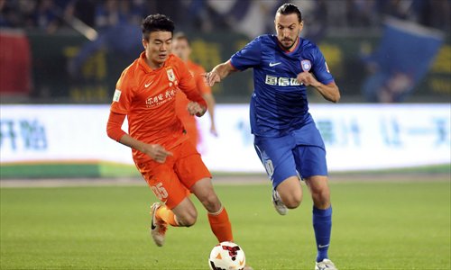 Shandong Luneng's Dai Lin (No.35) competes with Jiangsu Sainty's Dejan Damjanovic in Nanjing, Jiangsu Province on Wednesday. Photo: CFP
