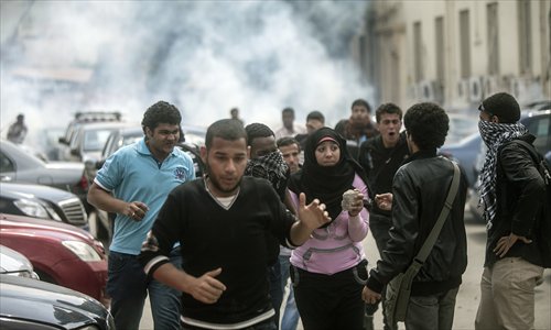 Egyptian students, supporters of the Muslim Brotherhood and ousted Islamist president Mohamed Morsi, run for cover as tear gas is fired by Egyptian riot police during clashes following a demonstration outside Cairo University on Wednesday. Photo: AFP