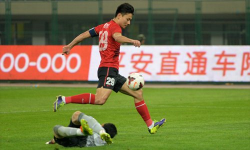 Gao Lin of Guangzhou Evergrande vies for the ball against Tianjin Teda keeper Zong Lei during the two sides' game on Friday in Tianjin. Photo: CFP