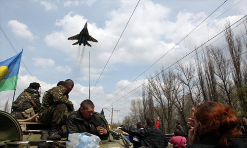 A Ukrainian fighter plane flies above pro-Russian activists blocking a column of Ukrainian men riding armored personnel carriers in the eastern city of Kramatorsk on Wednesday. Photo: AFP