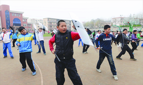 A group of primary school students in Qingdao, Shandong Province, learn how to wield police batons and riot shields under the instruction of armed police. The school said it hopes the activity will help students to be more patriotic and stay in good health. Photo: CFP