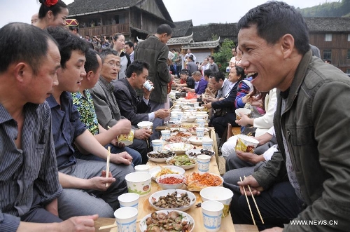 People enjoy the get-together banquet in Tongdao Dong Autonomous County, central China's Hunan Province, April 17, 2014. Some 1000 tourists took part in a traditional get-together banquet, in which various dishes were offered by every local family.(Xinhua/Ming Xing)