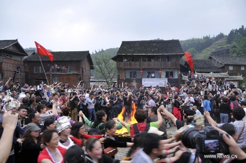 People attend a bonfire party after the get-together banquet in Tongdao Dong Autonomous County, central China's Hunan Province, April 17, 2014. Some 1,000 tourists took part in a traditional get-together banquet, in which various dishes were offered by every local family. (Xinhua/Ming Xing)