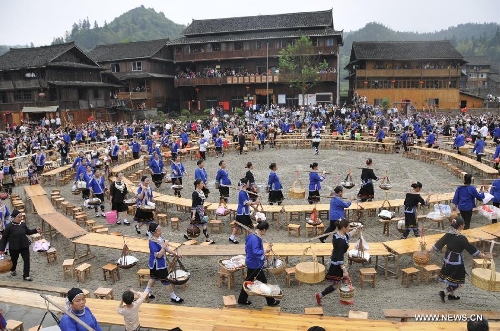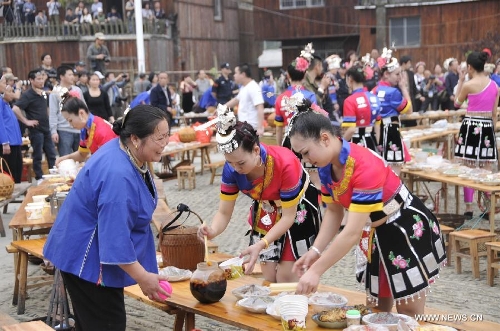 People of the Dong ethnic group prepare for their get-together banquet in Tongdao Dong Autonomous County, central China's Hunan Province, April 17, 2014. Some 1000 tourists took part in a traditional get-together banquet, in which various dishes were offered by every local family.(Xinhua/Ming Xing)