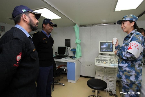 Medical staff members from the Pakistan naval ship visit a Chinese clinic during the multi-country maritime exercises off the coast of Qingdao, east China's Shandong Province, April 23, 2014. Nineteen ships, seven helicopters and marine corps from eight countries including China, Bangladesh, Pakistan, Singapore, Indonesia, India, Malaysia and Brunei were organized into three task forces to conduct the exercises dubbed "Maritime Cooperation - 2014". (Xinhua/Huang Yuping)