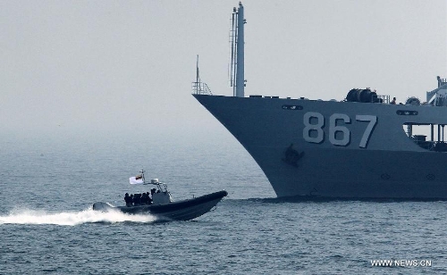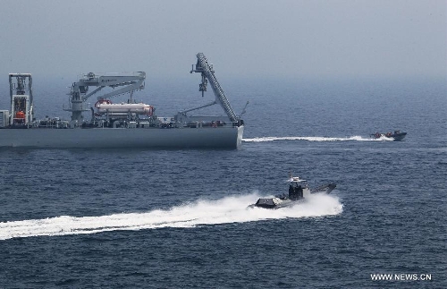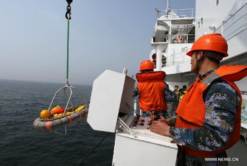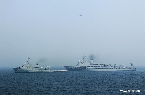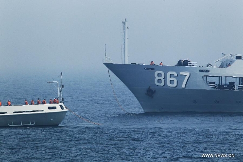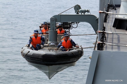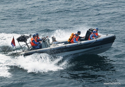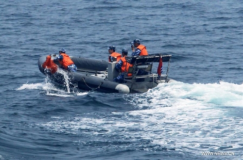 Chinese rescuers search for suspicious flotage during the multi-country maritime exercises off the coast of Qingdao, east China's Shandong Province, April 23, 2014. Nineteen ships, seven helicopters and marine corps from eight countries including China, Bangladesh, Pakistan, Singapore, Indonesia, India, Malaysia and Brunei were organized into three task forces to conduct the exercises dubbed "Maritime Cooperation - 2014". (Xinhua/Zha Chunming)