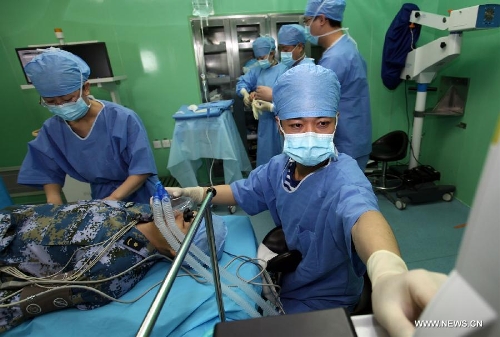 Medical staff members provide treatment for the "wounded" during the multi-country maritime exercises off the coast of Qingdao, east China's Shandong Province, April 23, 2014. Nineteen ships, seven helicopters and marine corps from eight countries including China, Bangladesh, Pakistan, Singapore, Indonesia, India, Malaysia and Brunei were organized into three task forces to conduct the exercises dubbed "Maritime Cooperation - 2014". (Xinhua/Huang Yuping)