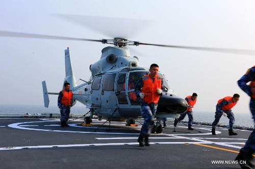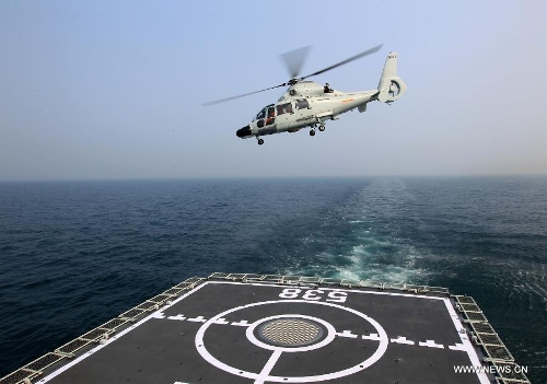 A helicopter takes off from a Chinese naval ship during the multi-country maritime exercises off the coast of Qingdao, east China's Shandong Province, April 23, 2014. Nineteen ships, seven helicopters and marine corps from eight countries including China, Bangladesh, Pakistan, Singapore, Indonesia, India, Malaysia and Brunei were organized into three task forces to conduct the exercises dubbed "Maritime Cooperation - 2014". (Xinhua/Zha Chunming)