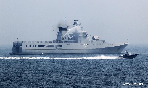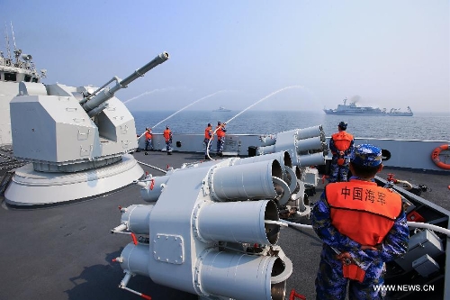 Soldiers on the Chinese naval ship put out a fire on another ship during the multi-country maritime exercises off the coast of Qingdao, east China's Shandong Province, April 23, 2014. Nineteen ships, seven helicopters and marine corps from eight countries including China, Bangladesh, Pakistan, Singapore, Indonesia, India, Malaysia and Brunei were organized into three task forces to conduct the exercises dubbed "Maritime Cooperation - 2014". (Xinhua/Zha Chunming)