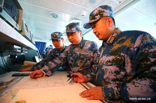 Commanders discuss the situation during the multi-country maritime exercises off the coast of Qingdao, east China's Shandong Province, April 23, 2014. Nineteen ships, seven helicopters and marine corps from eight countries including China, Bangladesh, Pakistan, Singapore, Indonesia, India, Malaysia and Brunei were organized into three task forces to conduct the exercises dubbed "Maritime Cooperation - 2014". (Xinhua/Zha Chunming)