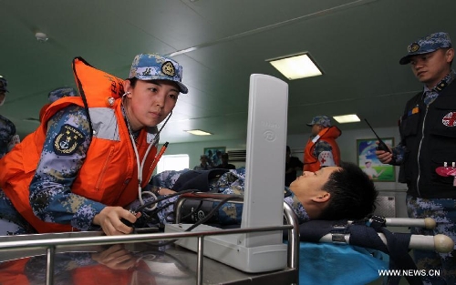 Medical staff members provide survey for the "wounded" during the multi-country maritime exercises off the coast of Qingdao, east China's Shandong Province, April 23, 2014. Nineteen ships, seven helicopters and marine corps from eight countries including China, Bangladesh, Pakistan, Singapore, Indonesia, India, Malaysia and Brunei were organized into three task forces to conduct the exercises dubbed "Maritime Cooperation - 2014". (Xinhua/Huang Yuping)