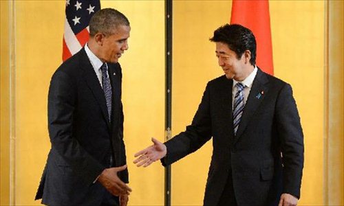 US President Barack Obama (L) shakes hands with Japanese Prime Minister Shinzo Abe (R) at the Akasaka guesthouse in Tokyo on April 24, 2014. Visiting US President Barack Obama and Japanese Prime Minister Shinzo Abe on Thursday vowed to enhance bilateral ties and agree to continue their talks on the US-led Trans-Pacific Partnership (TPP) free trade talks. Photo: Xinhua