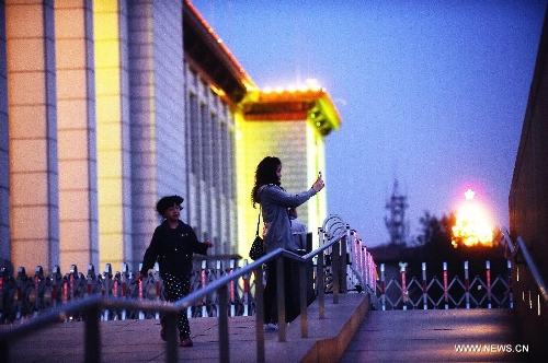 Visitors leave the National Museum of China in Beijing, capital of China, April 26, 2014. To meet visitors' high demand for the exhibition "Ten Masterpieces of French Painting", the National Museum of China prolonged its opening hours to 20:00 on four Saturdays. (Xinhua/Jin Liangkuai)