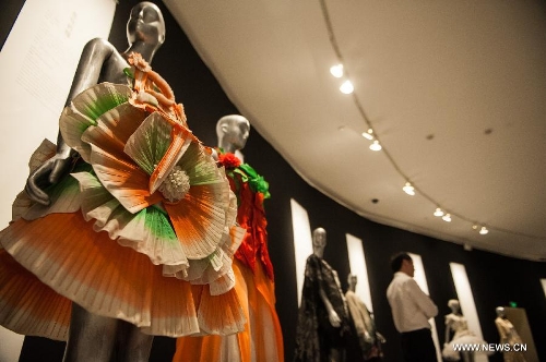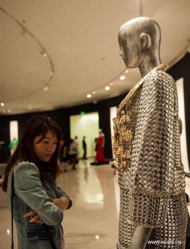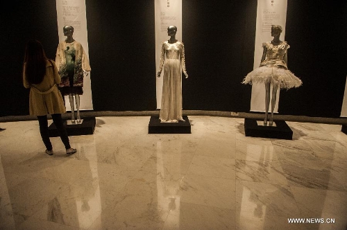 A visitor views exhibits during the "Reflection of Time - Art of Fashion in China 1993-2012" in Shenzhen, south China's Guangdong Province, April 26, 2014. The exhibition, displaying more than 100 creative works of fashion created by 70 Chinese designers in the past 20 years, is dedicated to showcasing the overall development of Chinese fashion design and the creative concepts. (Xinhua/Mao Siqian)