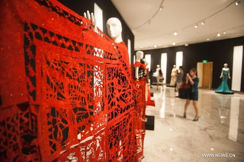 A visitor views an exhibit during the "Reflection of Time - Art of Fashion in China 1993-2012" in Shenzhen, south China's Guangdong Province, April 26, 2014. The exhibition, displaying more than 100 creative works of fashion created by 70 Chinese designers in the past 20 years, is dedicated to showcasing the overall development of Chinese fashion design and the creative concepts. (Xinhua/Mao Siqian)