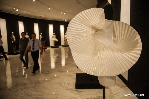 Visitors view exhibits during the "Reflection of Time - Art of Fashion in China 1993-2012" in Shenzhen, south China's Guangdong Province, April 26, 2014. The exhibition, displaying more than 100 creative works of fashion created by 70 Chinese designers in the past 20 years, is dedicated to showcasing the overall development of Chinese fashion design and the creative concepts. (Xinhua/Mao Siqian)