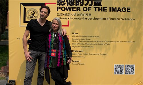 Photographer Sylvia Plachy (R) stands with her son Adrien Brody at the Power of the Image exhibition in Beijing on Friday. Photo: Courtesy of the Beijing Fuhai Culture Development Company