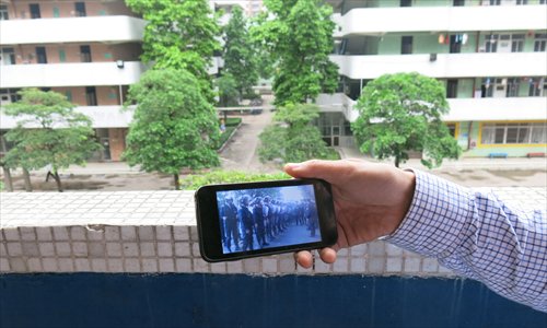 A Yue Yuen factory worker displays pictures of armed police that he took during the mass protest by Yue Yuen workers. Photo: Li Qian/GT