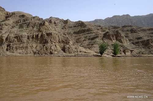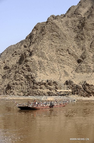 A boat is seen on the Yellow River at the Heishan Gorge area in Zhongwei City, northwest China's Ningxia Hui Autonomous Region, Apirl 29, 2014. (Xinhua/Li Ran)