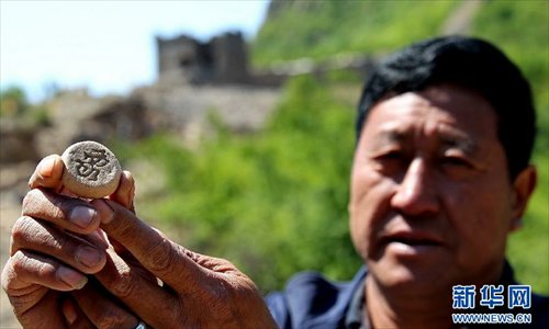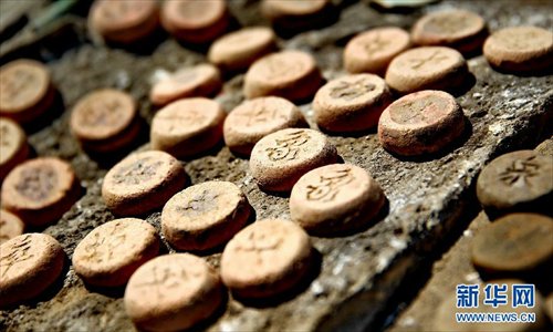 Pictured are Chinese chess pieces discovered by workers during a recent renovation of the Great Wall in Qinhuangdao, Hebei Province on May 5. The pieces date back to the Ming Dynasty (1368-1644). Photo: xinhuanet.com