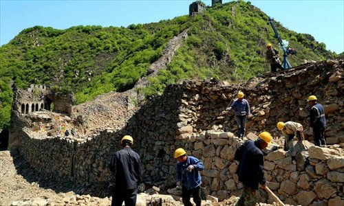 Workers repair a section of the Great Wall at the Banchangyu scenic spot, Qinhuangdao, Hebei Province on May 5. Photo: xinhuanet.com