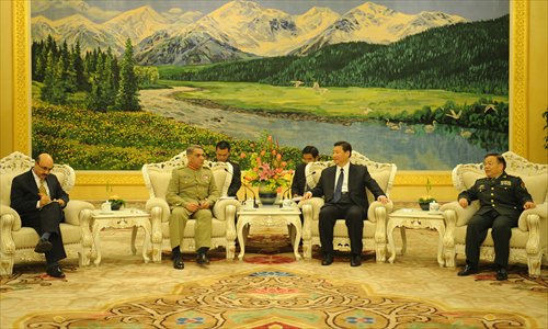 Zhang Li (R) and then Vice-president Xi Jinping (2nd from right) sit down with then Pakistan Chairman of the Joint Chiefs of Staff Committee General Tariq Majid (third from right) in 2008. Photo: Courtesy of Zhang Li