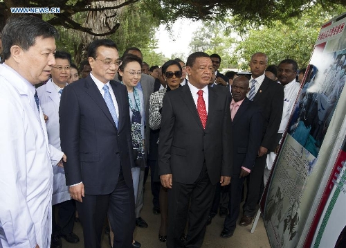 Chinese Premier Li Keqiang (C front) and Ethiopian President Mulatu Teshome (R front) look at the introduction of the free ophthalmological service "Bright Journey" provided by China at Alert Hospital in Addis Ababa, Ethiopia, May 6, 2014. (Xinhua/Xie Huanchi)