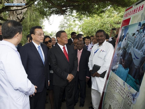 Chinese Premier Li Keqiang (3rd L front) and Ethiopian President Mulatu Teshome (3rd R) visit a patient who has received a free cataract surgical operation of the program "Bright Journey" provided by China at Alert Hospital in Addis Ababa, Ethiopia, May 6, 2014. (Xinhua/Li Tao)