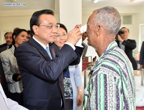 Chinese Premier Li Keqiang (L front) opens the gauze of a patient who has received a free cataract surgical operation of the program "Bright Journey" provided by China at Alert Hospital in Addis Ababa, Ethiopia, May 6, 2014. (Xinhua/Li Tao)
