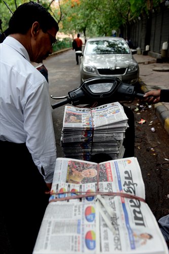 A pedestrian reads the front page of a Hindi-language daily stacked on a newspaper deliveryman's scooter, with the headlines on exit polls showing opposition Bharatiya Janata Party (BJP) prime ministerial candidate Narendra Modi possibly clinching victory in the country's national election, in New Delhi on Tuesday. Photo: AFP