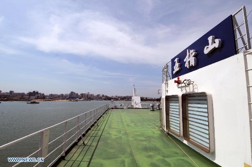 Passenger ship "Tongguling" is to set off for Vietnam at Xiuying port in Haikou, capital of south China's Hainan Province, May 18, 2014. "Tongguling" left for Vietnam from Xiuying port on Sunday. China began on Sunday to send five ships to evacuate Chinese nationals caught in a deadly anti-China violence in Vietnam. "Wuzhishan" and "Tongguling" were the first two ships leaving for Vietnam. (Xinhua/Guo Cheng)