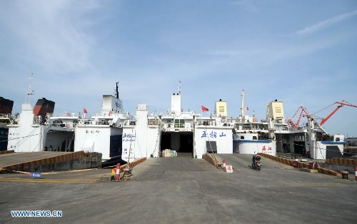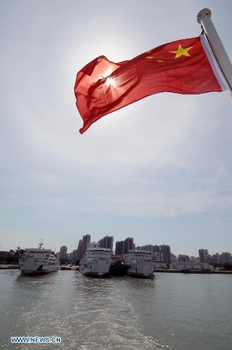 Passenger ships "Wuzhishan" (C) and "Tongguling" (L) are on standby at Xiuying port in Haikou, capital of south China's Hainan Province, May 18, 2014. "Wuzhishan" left for Vietnam from Xiuying port on Sunday. China began on Sunday to send five ships to evacuate Chinese nationals caught in a deadly anti-China violence in Vietnam, the Ministry of Transport has said. "Wuzhishan" was the first ship leaving for Vietnam. (Xinhua/Wei Hua)
