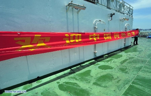 Crew members put the banner reading "Welcome Chinese Nationals Back Home" onto the passenger ship "Tongguling" at Xiuying port in Haikou, capital of south China's Hainan Province, May 18, 2014. "Tongguling" left for Vietnam from Xiuying port on Sunday. China began on Sunday to send five ships to evacuate Chinese nationals caught in a deadly anti-China violence in Vietnam. "Wuzhishan" and "Tongguling" were the first two ships leaving for Vietnam. (Xinhua/Guo Cheng)