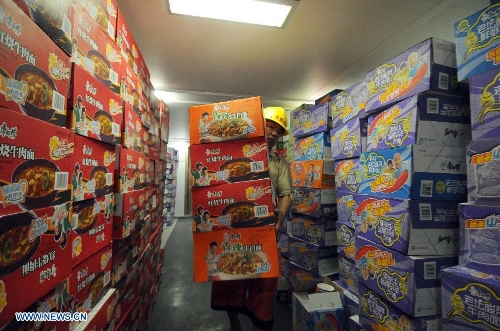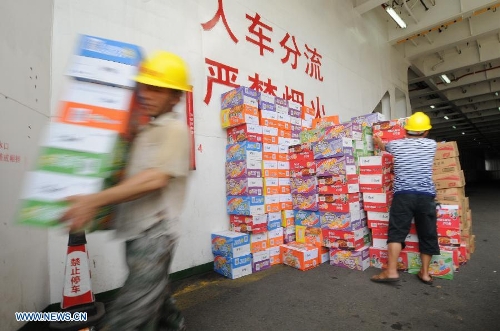 A worker loads food and supplies onto passenger ship "Wuzhishan" at Xiuying port in Haikou, capital of south China's Hainan Province, May 18, 2014. "Wuzhishan" left for Vietnam from Xiuying port on Sunday. China began on Sunday to send five ships to evacuate Chinese nationals caught in a deadly anti-China violence in Vietnam, the Ministry of Transport has said. "Wuzhishan" was the first ship leaving for Vietnam. (Xinhua/Wei Hua)