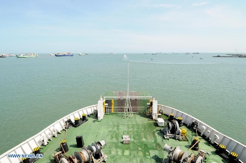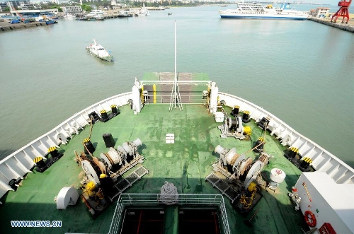 Passenger ship "Wuzhishan" leaves for Vietnam from Xiuying port in Haikou, China's southmost province of Hainan, May 18, 2014. China is to send five ships to Vietnam on Sunday to evacuate Chinese nationals caught in a deadly anti-China violence, the Ministry of Transport said. The first ship has already set off from Haikou, and is expected to reach Vietnam after 17 to 18 hours' travel, according to Hainan Maritime Safety Administration. (Xinhua/Wei Hua)