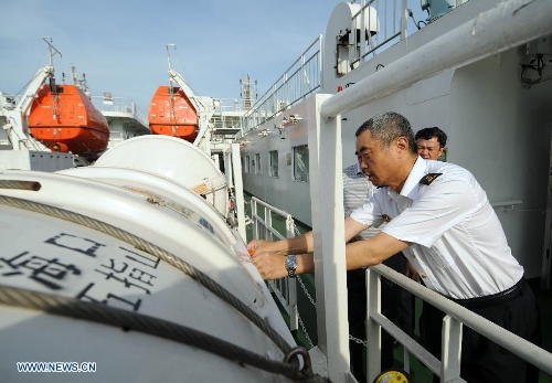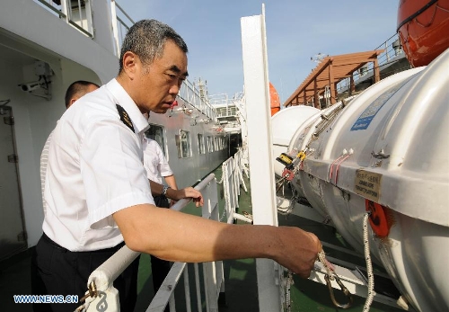 A maritime personnel checks the life rafts aboard passenger ship "Wuzhishan" at Xiuying port in Haikou, capital of south China's Hainan Province, May 18, 2014. "Wuzhishan" left for Vietnam from Xiuying port on Sunday. China began on Sunday to send five ships to evacuate Chinese nationals caught in a deadly anti-China violence in Vietnam, the Ministry of Transport has said. "Wuzhishan" was the first ship leaving for Vietnam. (Xinhua/Wei Hua)