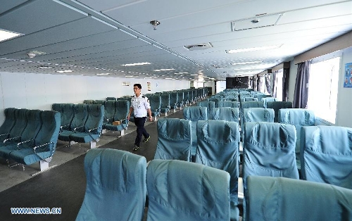 A crew member walks in the cabin aboard China's passenger ship "Tongguling" on May 18, 2014. "Tongguling" left for Vietnam from Xiuying port in Haikou, capital of south China's Hainan Province, on Sunday. China began on Sunday to send five ships to evacuate Chinese nationals caught in a deadly anti-China violence in Vietnam. "Wuzhishan" and "Tongguling" were the first two ships leaving for Vietnam. (Xinhua/Guo Cheng)