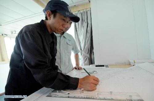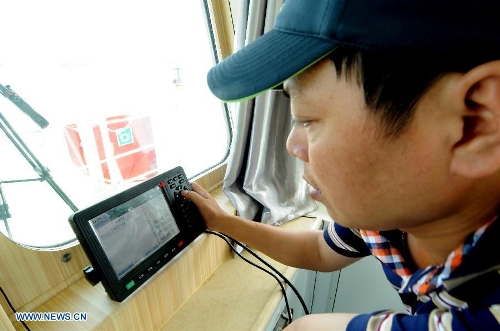 A crew member debugs the Beidou navigation system aboard China's passenger ship "Wuzhishan" on May 18, 2014. "Wuzhishan" left for Vietnam from Xiuying port in Haikou, capital of south China's Hainan Province, on Sunday. China began on Sunday to send five ships to evacuate Chinese nationals caught in a deadly anti-China violence in Vietnam, the Ministry of Transport has said. "Wuzhishan" was the first ship leaving for Vietnam. (Xinhua/Wei Hua)