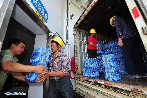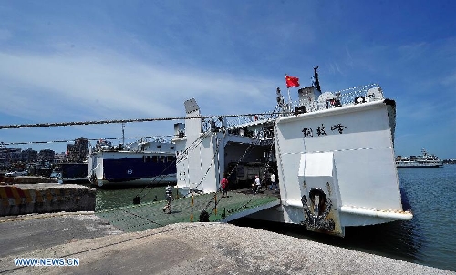 Workers load bottled water onto passenger ship "Tongguling" at Xiuying port in Haikou, capital of south China's Hainan Province, May 18, 2014. "Tongguling" left for Vietnam from Xiuying port on Sunday. China began on Sunday to send five ships to evacuate Chinese nationals caught in a deadly anti-China violence in Vietnam. "Wuzhishan" and "Tongguling" were the first two ships leaving for Vietnam. (Xinhua/Guo Cheng)